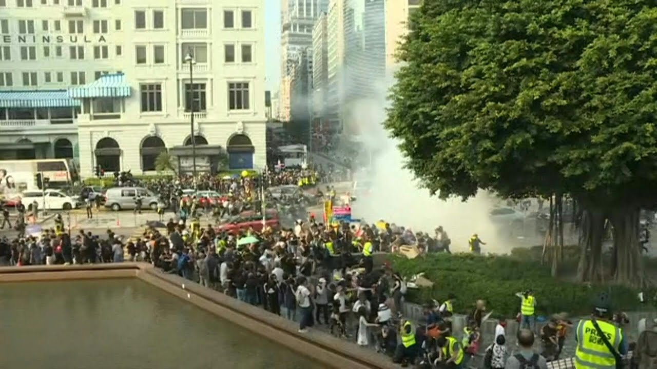 وارتفعت سحب الغاز فوق الشوارع التي تكون عادة مكتظة بالسياح، بما في ذلك خارج فندق "بينينسولا" الذي يعود إلى حقبة الاستعمار البريطاني، حيث اشتبك المحتجون والشرطة فيما بات مشهدا اسبوعيا.