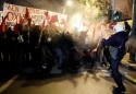 واستخدم المتظاهرون العصي لمهاجمة أفراد الشرطة الذين كانوا يسدون الشوارع في وسط أثينا، في الوقت الذي كانت فيه ميركل في اجتماع مع رئيس الوزراء اليوناني أليكسيس تسيبراس في مكتبه.